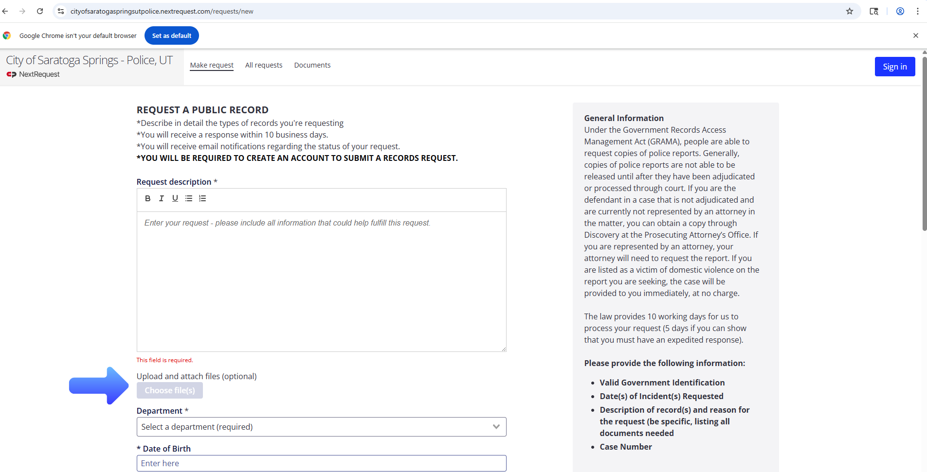 The law provides 10 working days for us to process your request (5 days if you can show that you must have an expedited response). When you make a request, you will be required to fill out a GRAMA Request Form. Please also provide the following information: